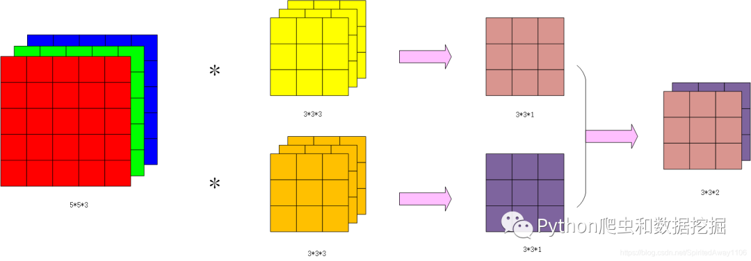 同时,可以设定多个卷积核,多个卷积核的结果沿通道方向排列,如下图所示