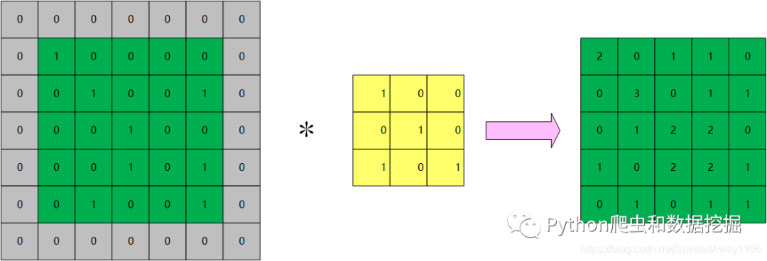 往往我们通过在图片四周补零的方式来处理,这种处理方式叫做,用表示补零数,如下图,我们对输入图的四周各补个零,即, 则相当于输入图大小变成了 ,利用公式可计算出特征图大小为