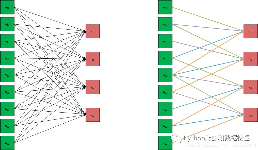 根据卷积的计算过程,我们可以用神经网络的表述方式来理解卷积操作,将输入图的矩阵拉直,成为神经网络的输入,卷积核则相当于一个权重矩阵(矩阵的各个参数值是需要学习得到的),特征图的每个元素值相当于神经元的输出,如下图右侧所示,左侧则是一个全连接的神经网络。
