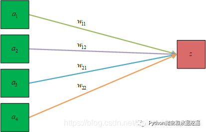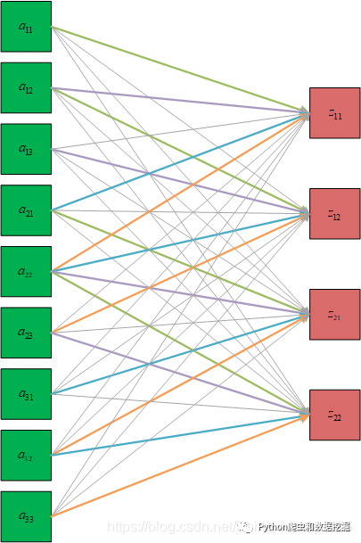 关于权值共享对后向传播的影响,只需要保证这些要共享的参数初始化和更新保持一致即可。以上图中紫色线条为例,图中共有四条紫色的线,对应的权重分别为(表示第个输入与第个输出之间的连接权重)反向传播时,误差对四个权重的偏导数分别为