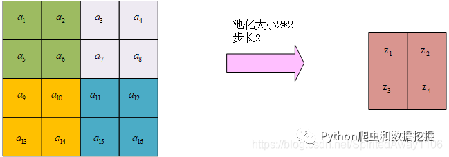 由于池化层没有需要学习的参数,在进行后向传播的时候直接将梯度按规则传递到前一层即可,为了方便描述,我们用下图描述池化的正向计算过程