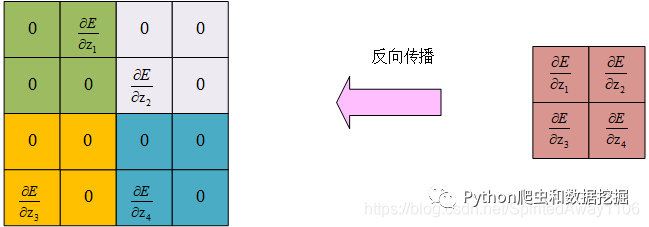 我们发现,对于最大池化,在进行误差反向传播时,误差项会原封不动的传递到上一层对应池化区域内的最大值对应的像素点(神经元),其他的神经元的误差项均为。