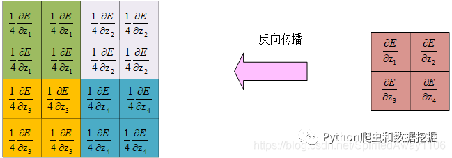 我们发现,对于平均池化,在进行误差反向传播时,误差项的值会平均分配到上一层对应池化区域内的所有神经元。