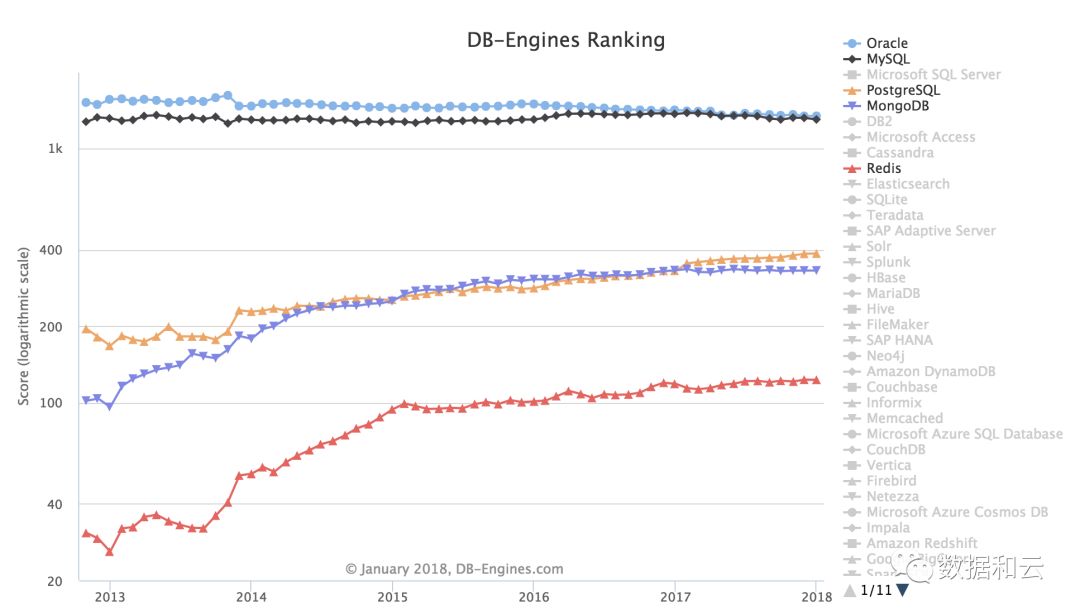 在2017年的DB-Engine的年度数据库榜单上,PostgreSQL以其超过其他341个受监控数据库管理系统的受欢迎程度居于榜首,被评为年度DBMS。其总体排名也超过MongoDB,在其流行程度上排名第四。