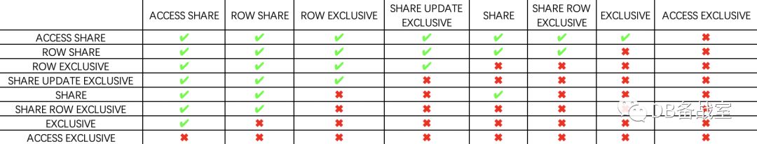 (1)ACCESS SHARE:select命令可在查询中引用的表上加这个类型的锁。一般情况下,是所有的操作中只有读表操作才加上这个类型的锁。