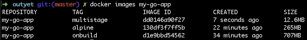 但同样,由此产生的镜像要小得多,大小只有256MB!但是,我们可以使镜像更小:您不需要Go附带的任何编译器或其他构建和调试工具,因此您可以从最终容器中删除它们。让我们使用多阶段构建来获取由golang:alpine容器创建的二进制文件并将其自行打包。dockerfile