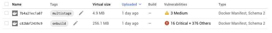 20秒的差距,这是使用两个不同容器镜像之间的最大差异。 您可以开始看到使用较小镜像的优势,尤其是在经常拉取镜像时。您还可以使用Google Container Builder在云中构建容器镜像,这样可以自动将它们存储在Google Container Registry中。Go Onbuild: 25 Seconds