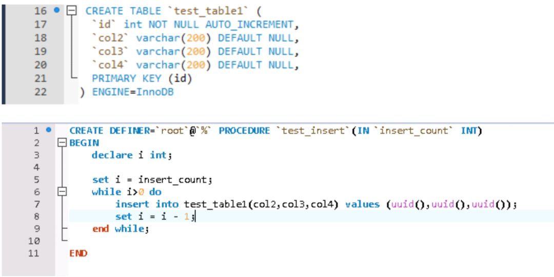测试数据比较简单,通过存储过程循环写入测试数据,测试表的 InnoDB 引擎表。