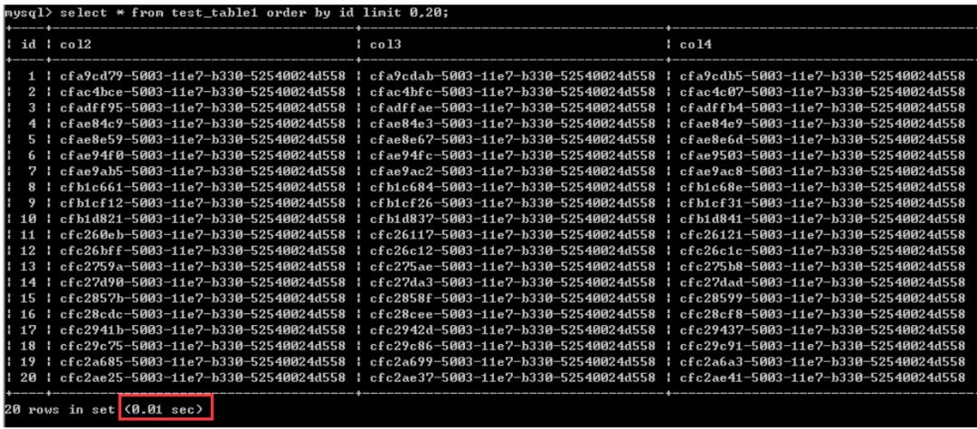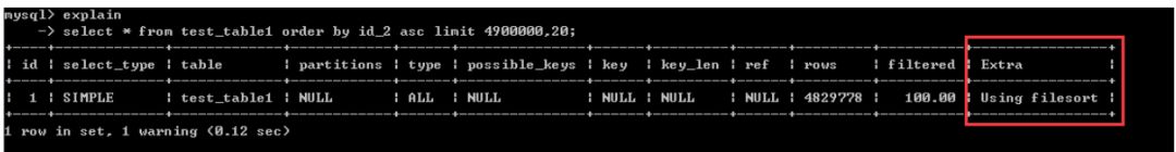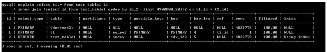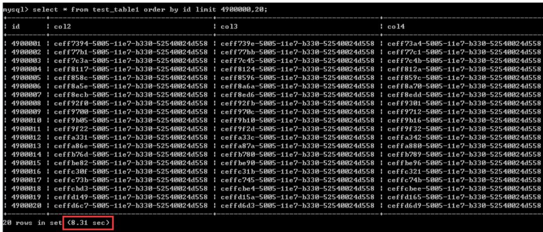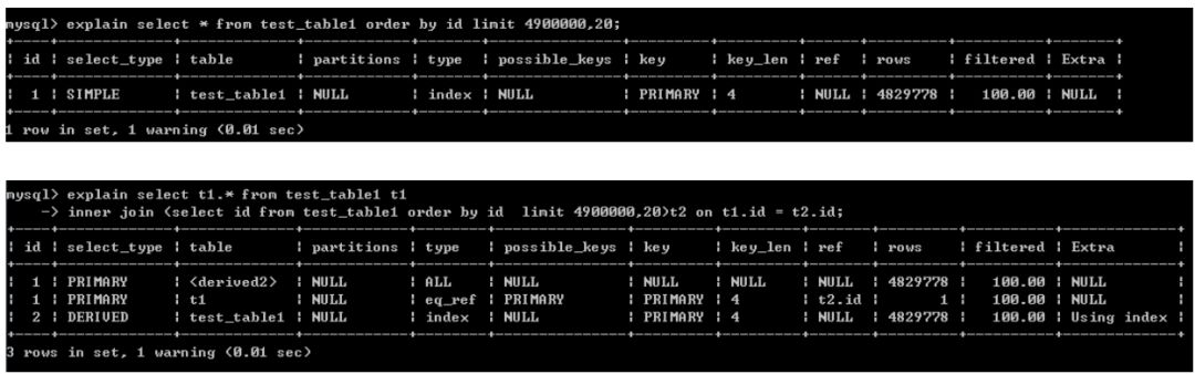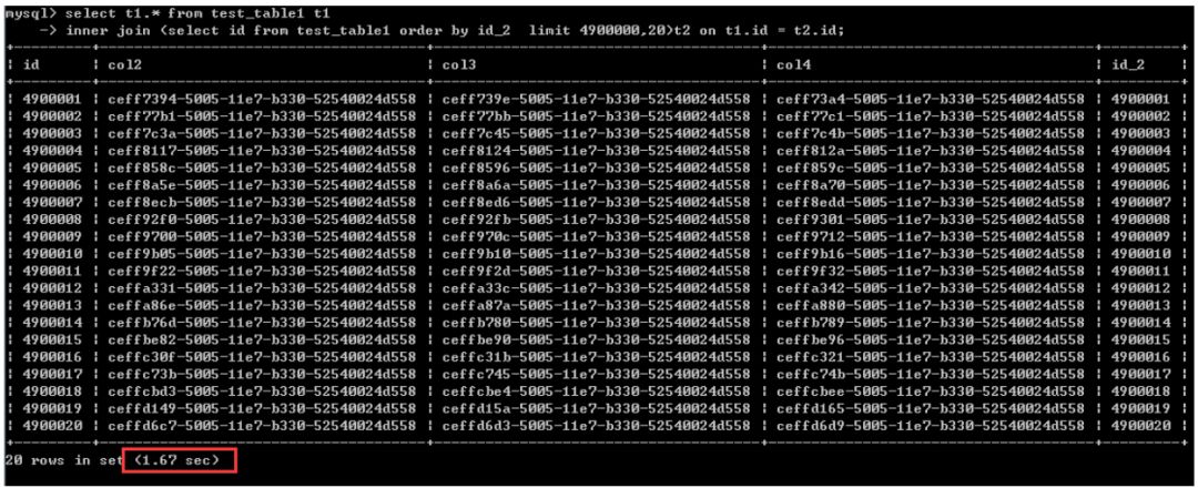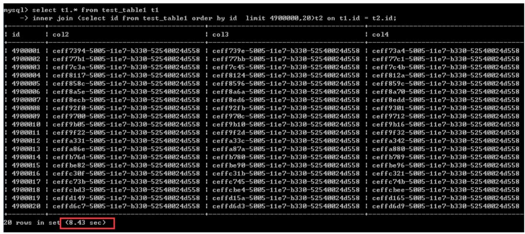 inner join (select id from test_table1 order by id limit 4900000,20)t2 on t1.id = t2.id;