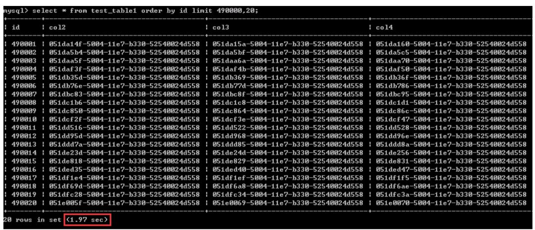 同样是查询20行数据,查询相对“靠后”的数据,比如这里的从 4900001-4900020 行数据的情况,用时1.97秒。