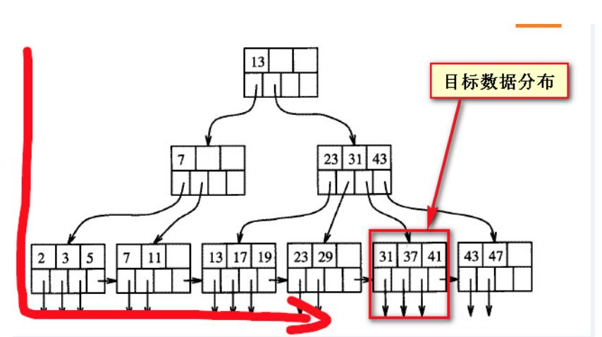 如下两个截图是B树索引结构的粗略表现形式,假如目标数据的位置固定的情况下,所谓的“靠后”是相对与从左向右来说的;