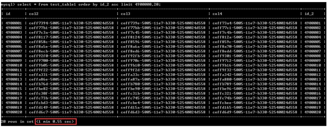 inner join (select id from test_table1 order by id_2 limit 4900000,20)t2 on t1.id = t2.id;