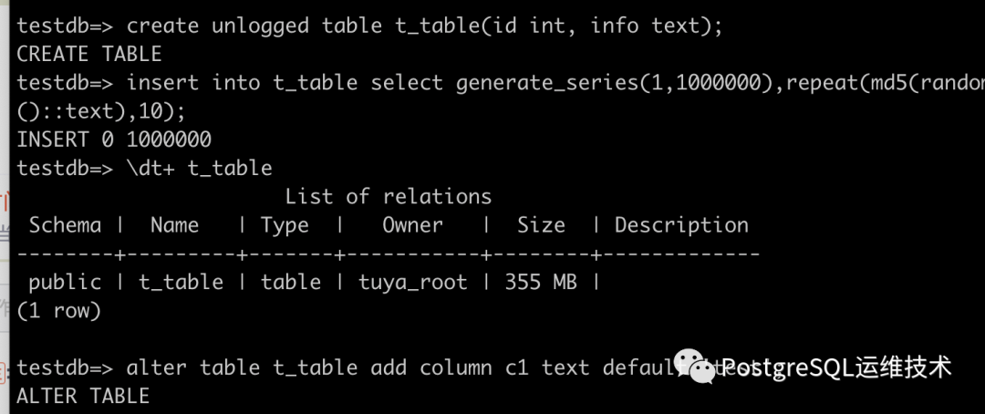 这个操作很快,新列的信息被添加到system catolog中,而不需要rewrite table。