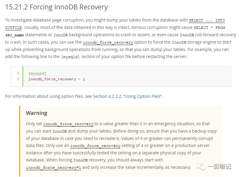 只有在紧急情况下将innodb_force_recovery设为大于0的值,你才能启动InnoDB并转储表。在进行此操作之前,确保你有数据库的备份副本,以备重建。4及以上的值可以永久破坏数据文件。只有在数据库的独立物理副本的成功地测试了设置,才能在生产服务器实例使用4及以上的innodb_force_recovery设置。当强制进行InnoDB恢复,你应该总是以innodb_force_recovery=1启动,且仅在必要时才逐渐增加值。