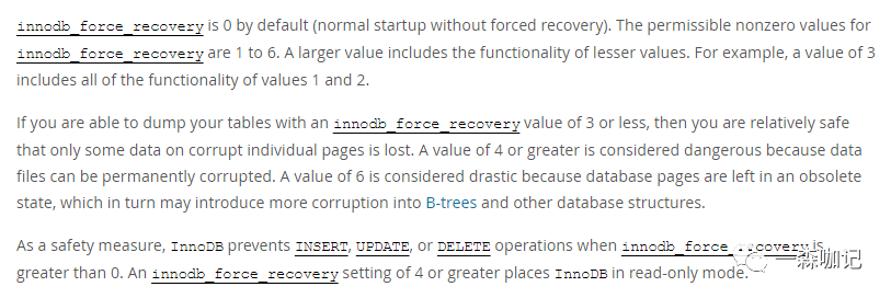 如果你能以innodb_force_recovery为3或更低值恢复/转储你的表时,这种情况库还相对安全的,因为只在相对独立的页上的一些数据会丢失。innodb_force_recovery>4时,数据库损坏度比较大/危险,因为数据文件被永久地损坏。值6被认为是严重的,数据库页被留在一个陈旧的状态,这反过来又可能带给B-trees和其它数据库结构更多的损坏。