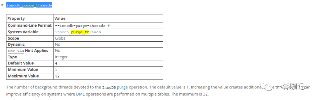 注意:Mysql 8版本中innodb_purge_threads =1(默认) ,官方介绍如下: