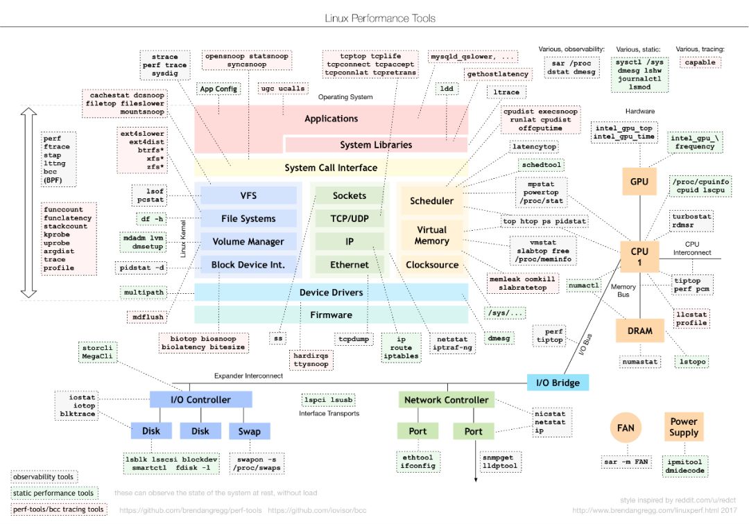 先上一个Linux性能工具图谱图,Brendan D. Gregg动态追踪工具 DTrace 的作者。