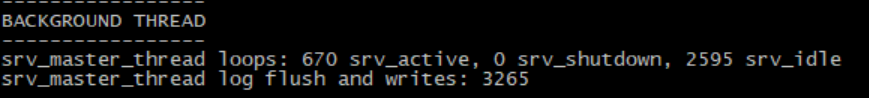 注:Background thread部分信息为统计信息,即mysql服务启动之后该部分值会一直递增,因为它显示的是自mysqld服务启动之后master线程所有的loop和log刷新操作。通过对比active和idle的值,可以获知系统整体负载情况。Active的值越大,证明服务越繁忙。 |