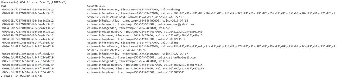 hive (default)> select * from hbase_user limit 1;OKhbase_user.id hbase_user.name hbase_user.phone hbase_user.birthday hbase_user.id_number hbase_user.gender hbase_user.email hbase_user.address0004928c7287408085403c6ec4cd3c12 刘英 15073203583 2013-07-15 211324199408301340 M maojuan@yahoo.com 黑龍江省晶市徐汇六盘水街J座 222331