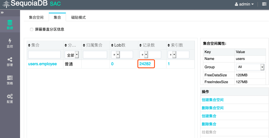 在 SequoiaDB 的图形化界面上,可以查看到导入到 SequoiaDB 中的数据条数为24282