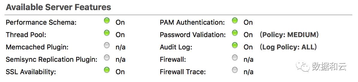 在比较了多方的RDS之后,Oracle MySQL Cloud Service确实如一直以来宣传的那样,提供了最多的安全选件功能,如果我们用MySQL Workbench登录到数据库中,在Server Status页面可以看到:SSL连接,PAM验证,密码校验,数据库审计等多种安全功能全部是开启的。