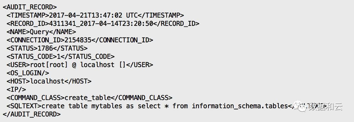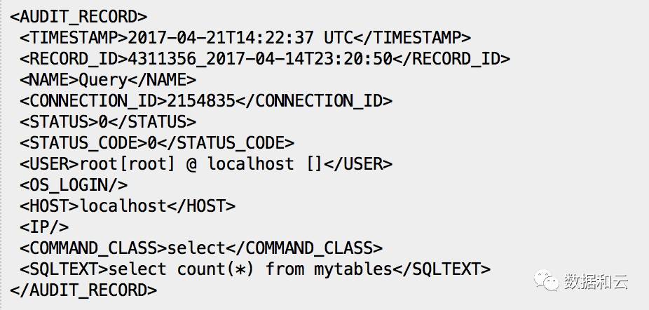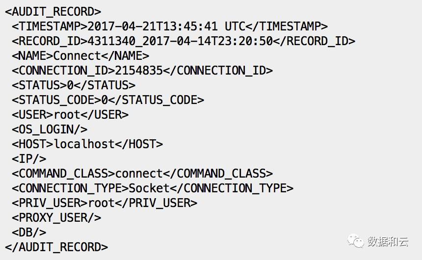 1. 用root用户登录,在audit文件中显示一条Connect类型的记录。TIMESTAMP记录了时间,USER标签记录了登录的用户,HOST标签记录了登录的机器,COMMAND_CLASS为connect。