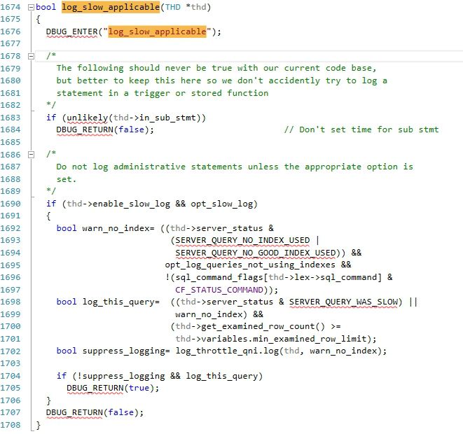 我们可以很容易看到log_slow_do()函数用于慢日志的记录,而if语句中的log_slow_applicable()函数则用来判断某个语句是否是慢日志,那么这个函数就很重要了。现在我们来具体看看这个函数。