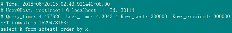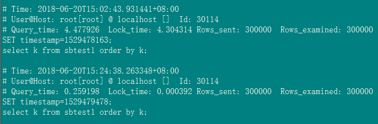 在对k列不创建索引和创建索引的情况下分别执行select k from sbtest1 order by k;慢日志中记录如下: