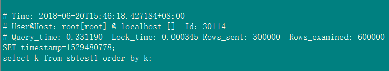 然后set long_query_time=0.6;在对k列不创建索引和创建索引的情况下分别执行select k from sbtest1 order by k;慢日志中记录并没有变化。