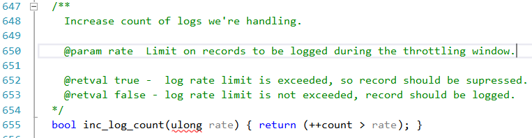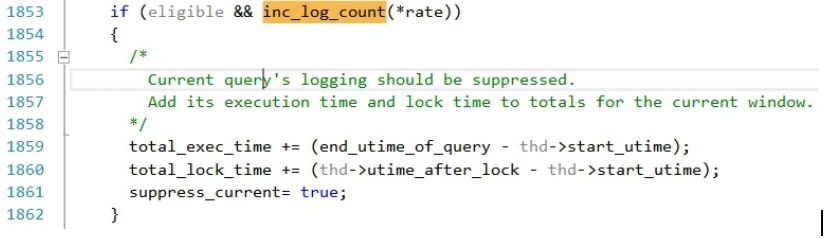 函数很简单,就是对count值进行++操作,直到count>rate时返回true,所以其实该函数就是用于找到阈值临界点,rate可以理解为log_throttle_queries_not_using_indexes参数值(临界点),当count++到该阈值时,就suppress this log,只计算一个总的时间。