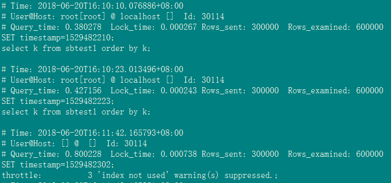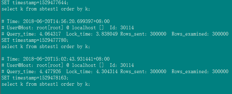 在对k列不创建索引和创建索引的情况下分别执行select k from sbtest1 order by k;慢日志中记录如下: