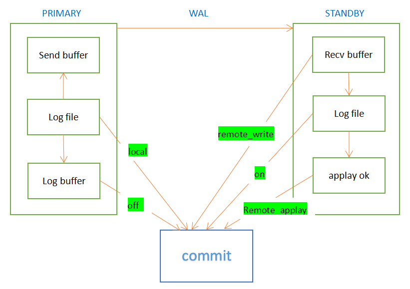 off:对于本机wal不用写到磁盘就可以提交,是异步模式,存在数据丢失风险。local:不管有没有备库只需要保证本机的wal日志刷到磁盘就行。remote_write:等待主库日志刷新到磁盘,同时日志传递到备库的操作系统缓存中,不需要刷盘就能提交,不能避免操作系统崩溃。on:如果没有备库,表示wal日志需要刷新到本地的磁盘中才能提交,如果存在同步备库时(synchronous_standby_name不为空),需要等待远程备库也刷新到磁盘主库才能提交。remote_apply:pg高版本才出来的功能,备库刷盘并且回放成功,事务被标记为可见,用于做负载均衡,读写分离等。