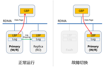 该方案可以满足大部分场景的高可用诉求,在主机故障后,备机回放完成所有接受到的物理日志,然后升为主机,提供读写服务。备机升为主机的时间,取决于备机的物理日志回放速度。如果业务压力较大,主机端产生的物理日志较快,备机可能会因为不能实时回放主机传送过来的日志,导致升主的时间较长,从而导致业务中断时间较长。GaussDB 100通过RDMA和GBP技术,来保证备机可以在1s之内快速升主,从而实现AZ内的极致高可用。