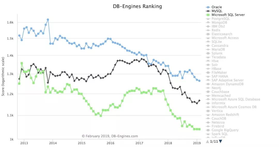 对于数据库领域的王者 Oracle 来说,这已经是连续第四个月下跌,分值再创新低,较最高点1617分下降了 353 分,跌幅为 22%,跌去了将近一个 MongoDB 。而SQL Server从最高点 1357 跌至本月1040分,跌去317分,同样较最高点跌去约 23%。