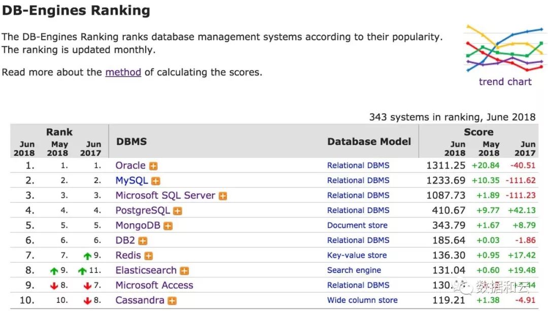 在6月排行榜上,Oracle的积分大幅上扬,获得20分的涨幅,而MySQL和SQL Server都是止住了连续6个月的跌幅恢复增长,MySQL获得10分的涨幅。另外一个快速增长的数据库是PostgreSQL,涨幅 9.77 分。其他数据库的积分波动,基本可以忽略。