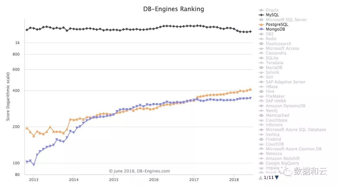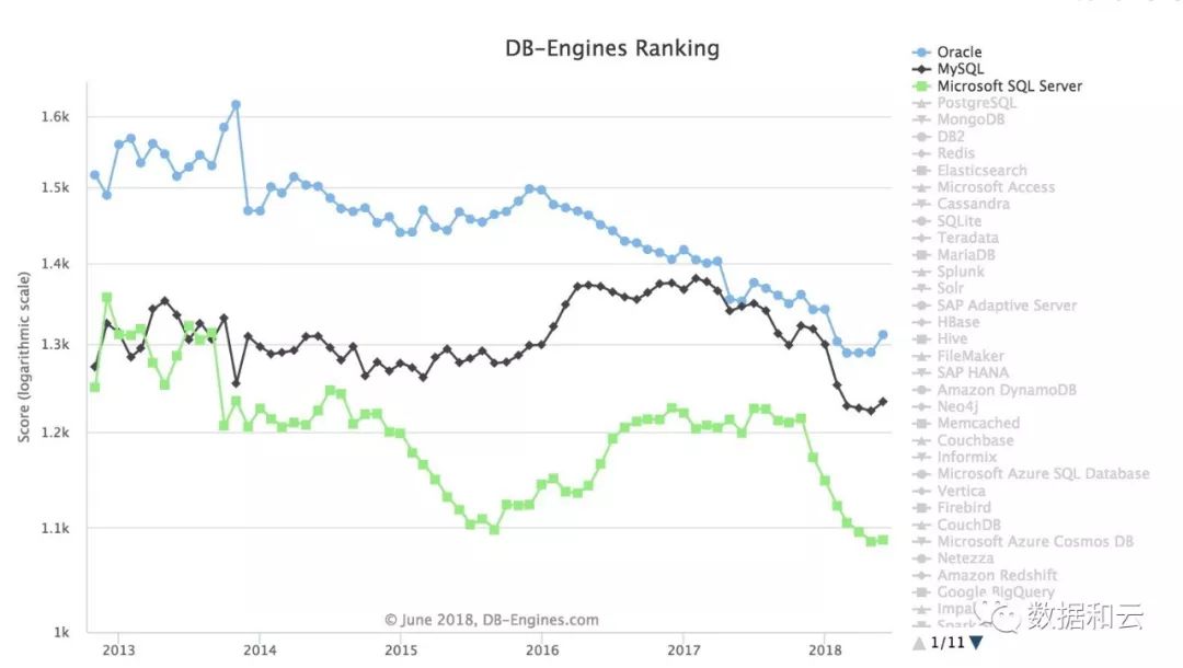 MySQL 同比获得10分增长,而且是结束了6个月的连跌,MySQL环比仍有111 分的减值,这说明MySQL已经是充分成熟的市场;