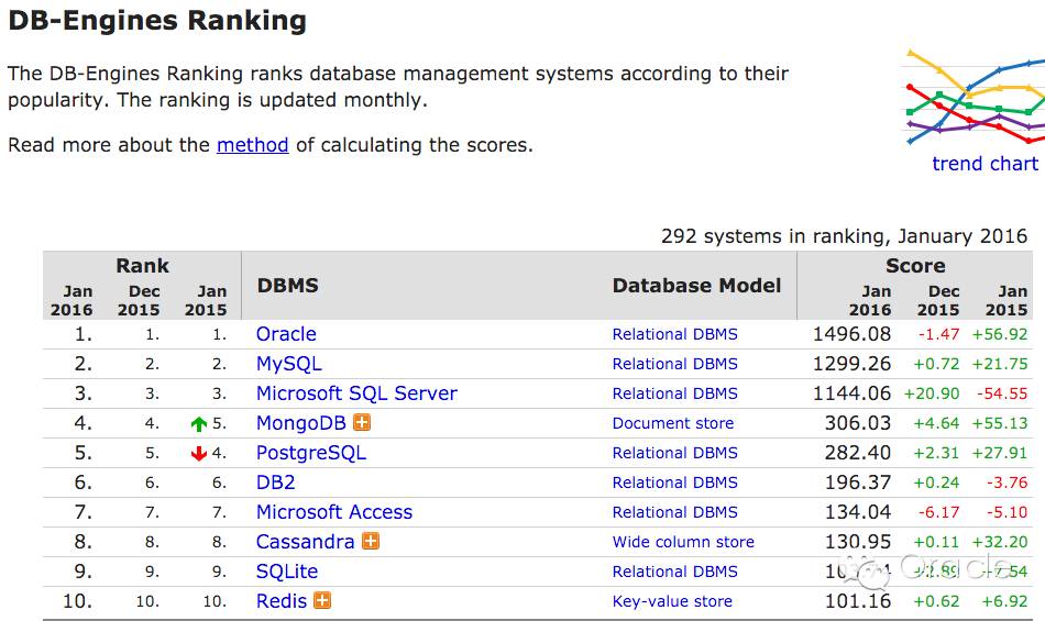 在DB-Engines排名监控的三年中,Oracle是DBMS领域毫无疑问的领导者,虽然Oracle的积分有所波动,但是在2015年,Oracle呈现出上升趋势,2015是Oracle的好年份,因此收获了56.9分的好成绩,相较之下MongoDB获得的分数是 55.1 ,在2013、2014的排上上MongoDB曾经是冠军。