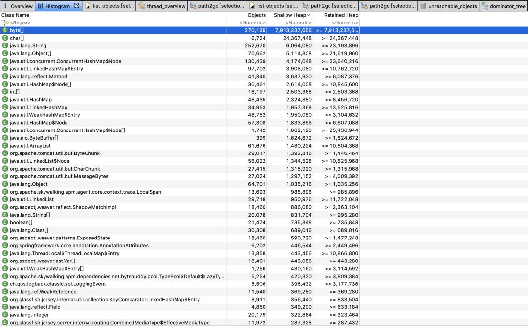 第一步就是打开Histogram看看占用内存最大的是什么对象: