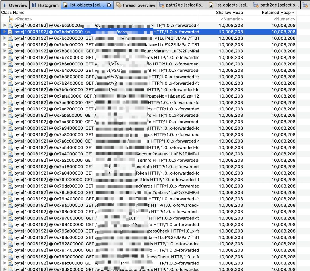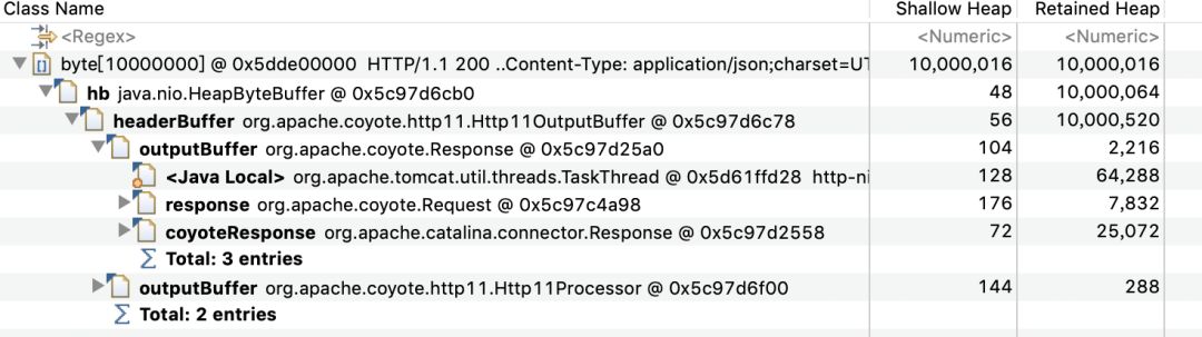 可以发现除了有10008192字节的数组还有10000000字节的数组,查看引用路径可以看到这个正好是10M的数组是output buffer,区别于之前看到的input buffer: