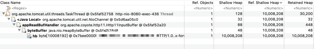 这符合之前的猜测,是tomcat的线程在处理过程中分配了10M的buffer在堆上。