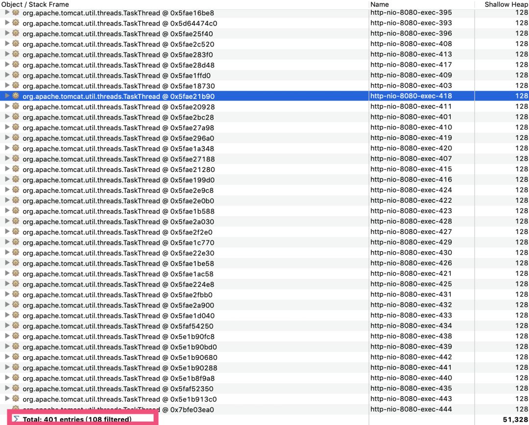 可以打开线程视图,搜索一下tomcat的工作线程,发现线程数量的确很多有401个,但是也只是800的一半: