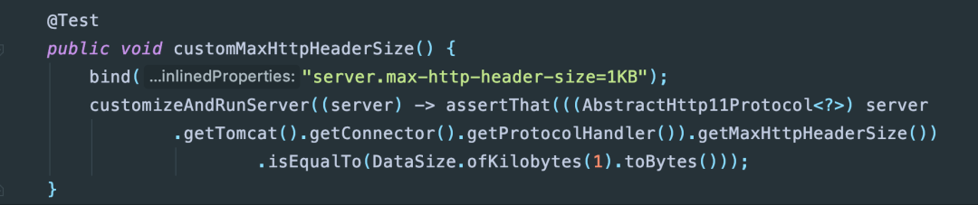 再来看看问题2,这就需要来找一下源码了,首先max-http-header-size是springboot定义的参数,查看springboot代码,可以看到这个参数对于tomcat设置的是MaxHttpHeaderSize: