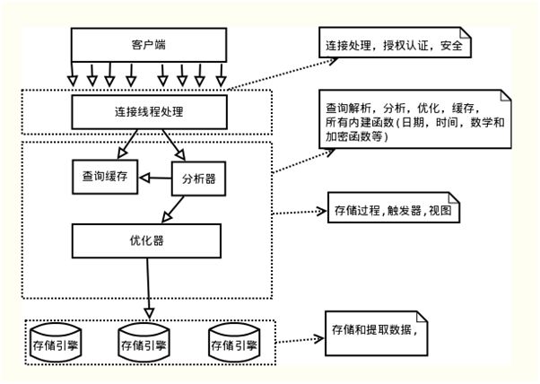 第二层:服务器层,负责查询语句的解析、优化、缓存以及内置函数的实现、存储过程等。