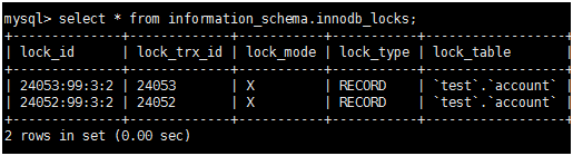 通过上述命令可以查看事务 24052 和 24053 占用锁的情况;其中 lock_type 为 RECORD,代表锁为行锁(记录锁);lock_mode 为 X,代表排它锁(写锁)。