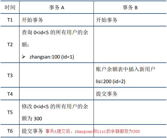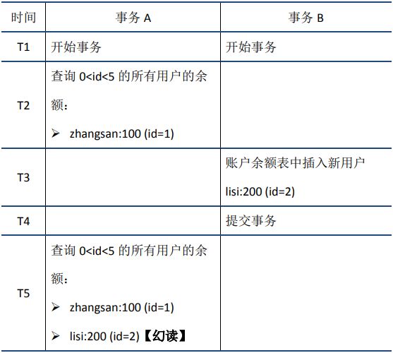 ③幻读:在事务 A 中按照某个条件先后两次查询数据库,两次查询结果的条数不同,这种现象称为幻读。