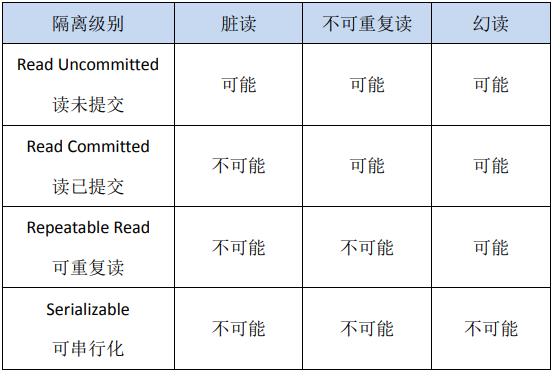 sql 标准中定义了四种隔离级别,并规定了每种隔离级别下上述几个问题是否存在。
