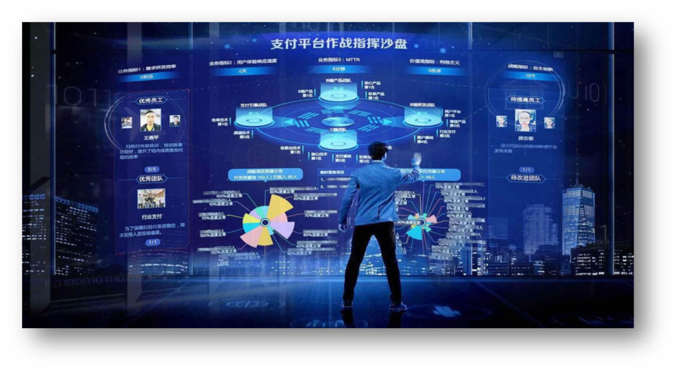 基于这个理念,我们做了一个可视化作战指挥系统。包括三大部分: 研发的可视化: 聚焦统一目标下的交付全链路、全资源可视化;统一目标是指公司的战略目标,从上图可见,战略目标KPI一定极简指标,要定北极星指标,一般我们会定三项,战略目标分解到事业部,事业部分解到研发中心对应具体需求,而需求的整个研发周期已经可视化了,可以清楚知道每一个需求、每天做的事情是不是帮助整个集团在完成战略目标。
