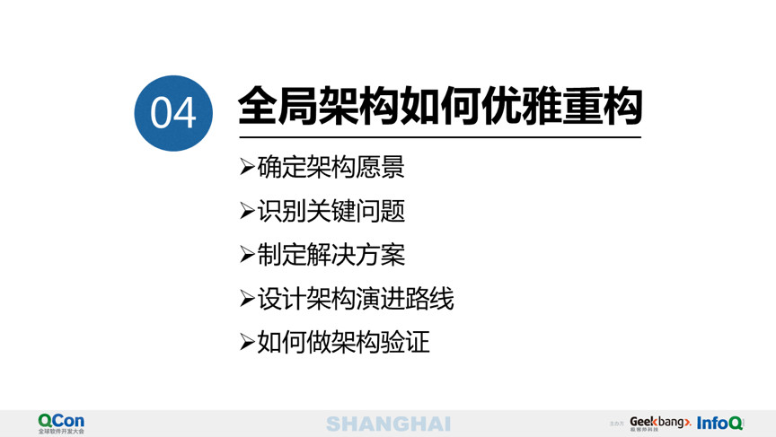 主要推演架构的高可用、可伸缩、研发成本,运维成本和迁移成本5个指标,通过这5个指标在上述3个方面的推演,基本上就可以验证架构合理性了,其实做架构决策也可以参考这个依据,比如多个研发中心,让你做架构决策,这个系统谁做合适?特别是架构师怎么让自己的架构决策做到大家都认可,这种思维方式都可以参考;