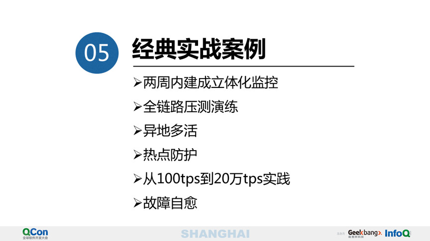 具体技术包括高可用设计技巧,高伸缩性设计思路,弹性的流量和资源控制,异地多活,全链路压测,消除数据瓶颈与单点,热点追踪与防护,故障自愈,账务系统之大账户瓶颈解决方案,以及未来怎么实现机器人自动巡检和自动修复等实战经验分享。