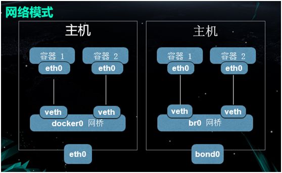 由于在生产环境中不只一张网卡,因此我们对它进行了改造。我们产生了一个“网卡绑定”,即生成了 bond0 网卡。我们通过创建一个 br0 网桥,来替换原来的 docker0 网桥。